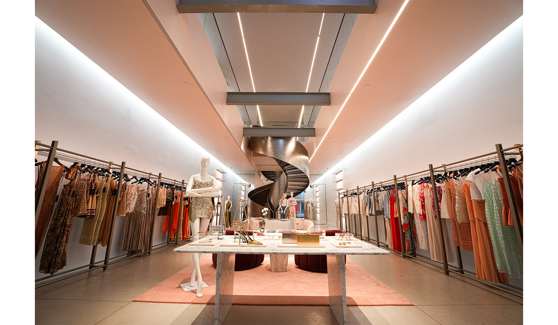 The new space, designed with Miami-based FXN Works, mirrors that balance of energy and ease. A sculptural steel staircase divides two open floors framed by rose-colored carpet, curved velvet seating, and marble tables. It feels luxurious but relaxed, more like a living room than a showroom. Soft lighting, warm textures, and an open layout give the store the same sense of warmth that defines the brand itself.